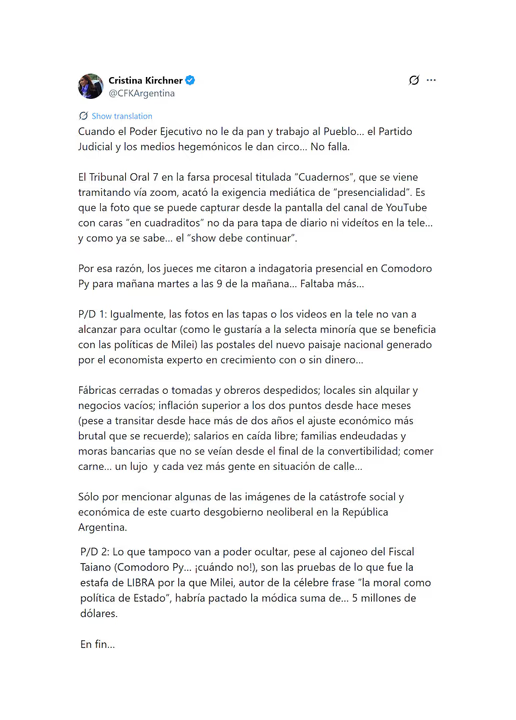 Con todo, en las horas previas a su declaración, la ex jefa de Estado volvió a pronunciarse públicamente sobre el proceso judicial en curso. A través de un mensaje publicado en la red social X cuestionó el desarrollo del juicio y calificó la causa como una “farsa procesal”, en un texto en el que también dirigió críticas al gobierno del presidente Javier Milei.“Cuando el Poder Ejecutivo no le da pan y trabajo al Pueblo… el Partido Judicial y los medios hegemónicos le dan circo…No falla. El Tribunal Oral 7 en la farsa procesal titulada ‘Cuadernos’, que se viene tramitando vía zoom, acató la exigencia mediática de ‘presencialidad’. Es que la foto que se puede capturar desde la pantalla del canal de YouTube con caras ‘en cuadraditos’ no da para tapa de diario ni videítos en la tele… y como ya se sabe… el ‘show debe continuar’“, expresó en un mensaje bajo el usuario @CFKArgentina.