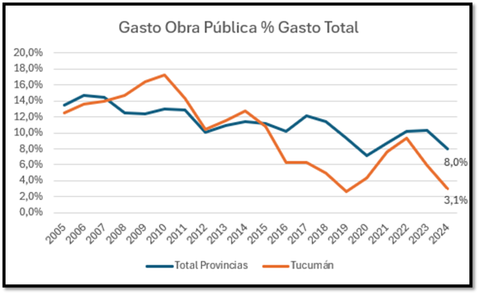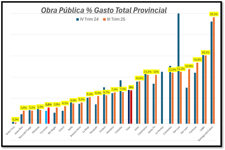 En los últimos años se ha querido reflotar la obra pública. Del 3% de 2024 hemos pasado al 4% de 2025. Es un aumento, pero no alcanza, hay que duplicar para llegar a la provincia promedio. Salta el 5%, Jujuy el 10%, Catamarca el 12% y Santiago el 25%.