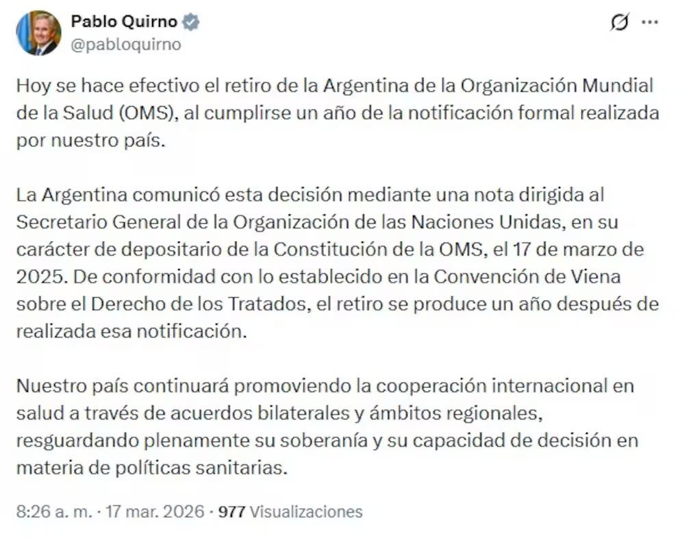 “Hoy se hace efectivo el retiro de la Argentina de la Organización Mundial de la Salud (OMS), al cumplirse un año de la notificación formal realizada por nuestro país”, informó el Ministro de Relaciones Exteriores Pablo Quirno a través de la red social X.