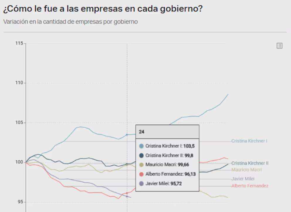 En el caso de Javier Milei, el nivel a mitad de mandato se ubica en torno a 95,7 puntos, por debajo del resto de las gestiones en ese mismo momento del ciclo, lo que marca un arranque más contractivo en términos de cantidad de empresas.