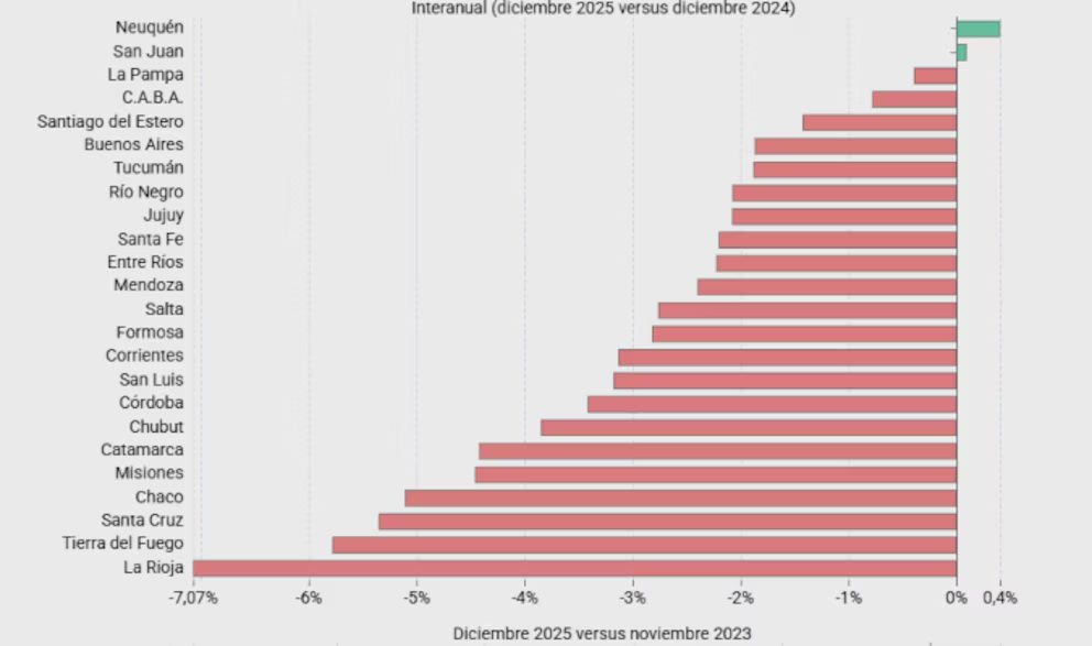 Los datos acumulados desde noviembre de 2023 refuerzan el diagnóstico: solo Neuquén muestra saldo positivo y La Rioja encabeza las bajas provinciales con una reducción cercana al 15%. Catamarca, Chaco, Tierra del Fuego, Corrientes y Misiones también informan retrocesos significativos. Infobae