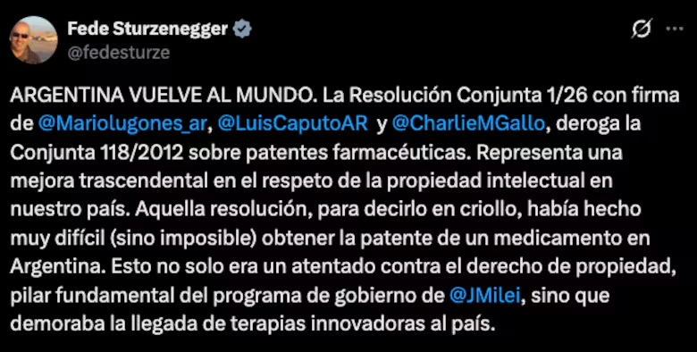 Sturzenegger vinculó la decisión con el programa de gobierno que encabeza Javier Milei: “El Presidente nos ha comandado a implementar políticas basadas en el precepto moral de hacer ‘lo que está bien’. Respetar la propiedad, entre ellas la intelectual, es una derivada directa del respeto a la libertad y la propiedad”, expresó en su posteo.