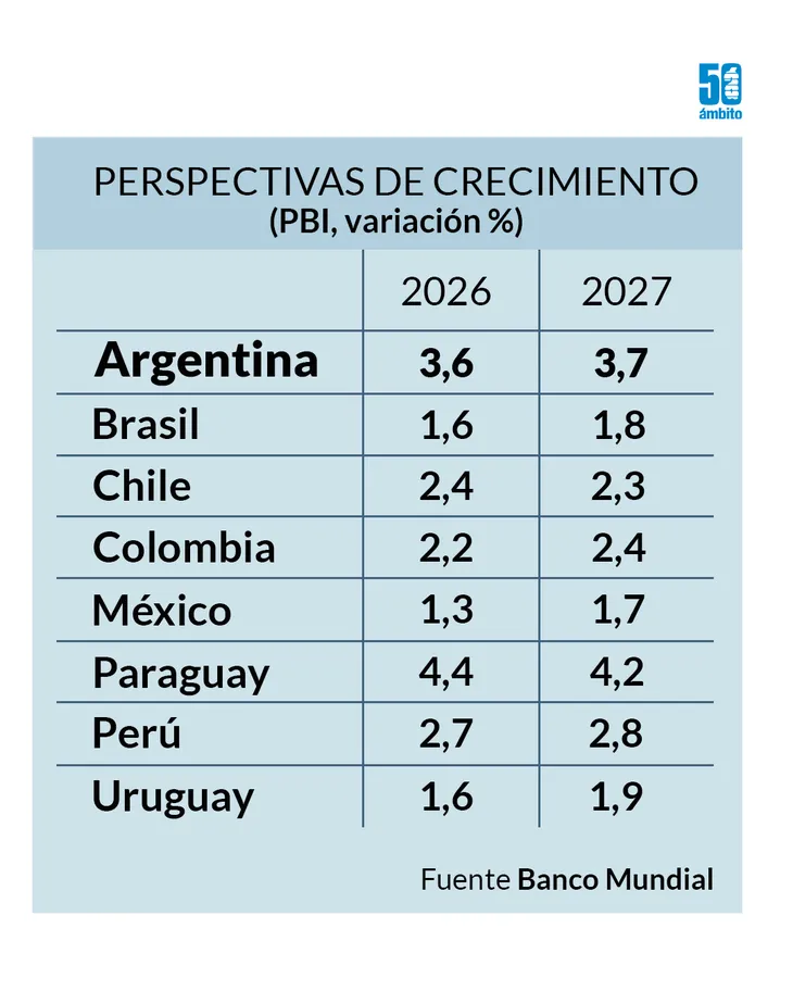 El Banco Mundial advierte sobre un crecimiento regional “limitado” al 2,1% para el año en curso, pero destaca a la Argentina “como la principal excepción al alza. El organismo anticipa un crecimiento del PBI argentino de 3,6% y 3,7% para 2026 y 2027, respectivamente.