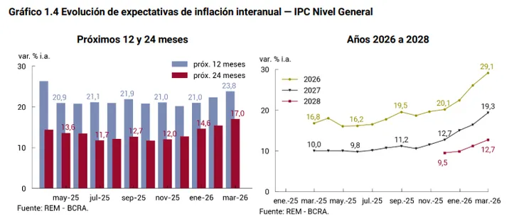 Hacia adelante, las proyecciones indican que la inflación recién perforará el 2% mensual en agosto, tres meses después de lo que se esperaba en el reporte anterior. Asimismo, el mercado estima que el Índice de Precios al Consumidor (IPC) acumulará un ascenso del 29,8% en 2026. Vale recordar que el año había comenzado con una expectativa del 22,4%.