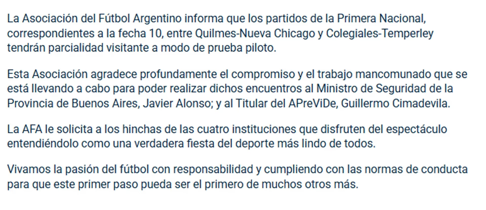 Los partidos elegidos para esta experiencia serán Quilmes vs. Nueva Chicago y Colegiales vs. Temperley, correspondientes a la décima fecha del campeonato. Ambos duelos contarán con las dos parcialidades, algo que no sucedía desde hace años en gran parte del fútbol.