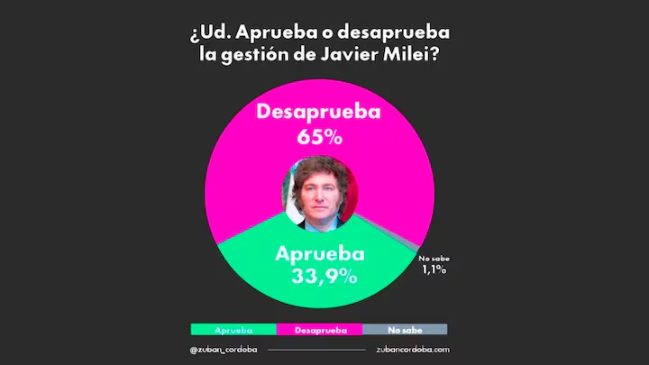 Nada menos que el 65 por ciento, dos de cada tres ciudadanos, desaprueban la gestión de Javier Milei al frente del gobierno, mientras que sólo el 33 por ciento la aprueba. Desde el punto de vista de la secuencia histórica se trata del peor momento del presidente libertario, porque antes de las elecciones de octubre de 2025 había estado en el 37, 1 por ciento de aprobación y fue entonces que Donald Trump extendió el cheque por 20.000 millones de dólares y salvó a La Libertad Avanza (LLA) de la derrota. Ahora, la caída es 4 puntos mayor que en octubre y la desaprobación creció en comparación con aquel momento. Lo que hay detrás de estas opiniones desfavorables es que el 55 por ciento de los ciudadanos dice que su situación económica personal empeoró en los últimos 12 meses y la preocupación más importante es que no se llega a fin de mes y que la familia contrae deudas. Una abrumadora mayoría no tiene expectativas sobre el futuro porque considera que el país, con Milei al frente, va en un rumbo incorrecto.