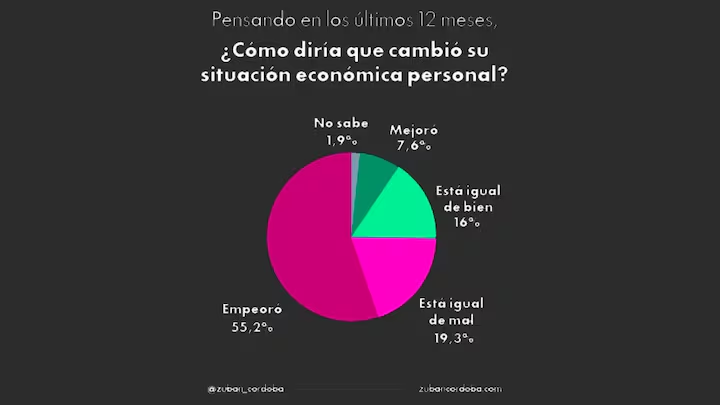 Las cosas están en línea con lo que sucede dentro del hogar. El 55 por ciento dice que su economía empeoró en los últimos doce meses y a eso se agrega otro 19 por ciento que dice que está “igual de mal que hace un año”. Es decir que, sumando, un 74 por ciento, tres de cada cuatro argentinos, están económicamente mal en su hogar, la mayoría peor que hace un año. Del otro lado, apenas un 7 por ciento dice que su situación mejoró y otro 16 por ciento afirma que está igual de bien que hace un año. Significa que sólo uno de cada cuatro argentinos mira las cosas con algo de optimismo. Lo que explica que un porcentaje mayor -33 por ciento- aprueba la gestión de Milei es que existe un núcleo duro libertario que apoya al mandatario pase lo que pase.