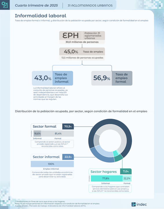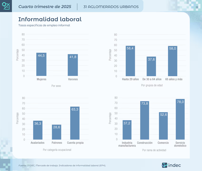 En medio de una alta precarización laboral, la informalidad laboral alcanzó el 43% en el cuarto trimestre de 2025 frente al 42% del mismo período del año previo, según informó el Instituto Nacional de Estadística y Censos (INDEC). Esto implica que 5,8 millones de argentinos, de los 31 aglomerados urbanos, no posee obra social ni descuento jubilatorio. La tasa más alta se observa entre las mujeres de hasta 29 años, donde el indicador alcanza el 57,9%; y las de 65 años y más, que tienen un índice de 61,6%.