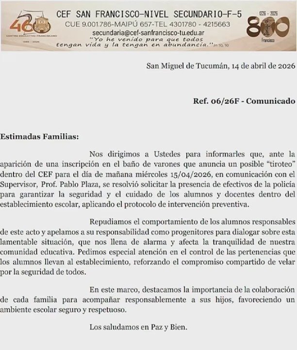 A pesar de la alarma generalizada por mensajes intimidatorios que circularon entre los alumnos, las autoridades del Colegio San Francisco y la Policía de Tucumán confirmaron que las clases se dictan de manera habitual bajo un fuerte operativo de seguridad. La institución aplicó protocolos de revisión exhaustiva para garantizar la integridad de los estudiantes y el personal.
