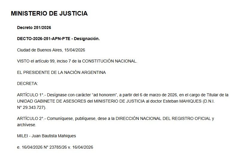 A través del Decreto 251/2026, el Gobierno oficializó el desembarco de Esteban Mahiques en la estructura del Ministerio de Justicia que conduce su hermano mayor, Juan Bautista. El nombramiento, que rige de manera retroactiva desde el 6 de marzo, se estableció con carácter ad honorem, lo que significa que el funcionario no percibirá salario por sus nuevas funciones.