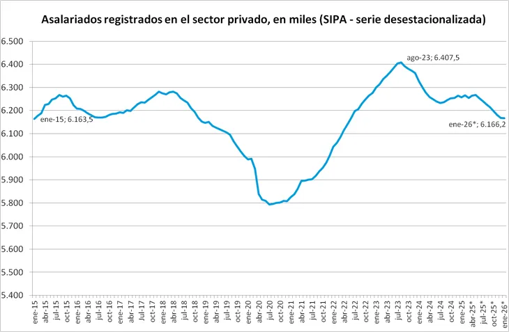 “En la comparación interanual, el poder adquisitivo del salario promedio de convenio registró una caída de 5,9% entre febrero de 2025 y febrero de 2026, mientras que el salario medio proveniente del SIPA evidenció una contracción más leve, de 0,2%”, concluye el informe.