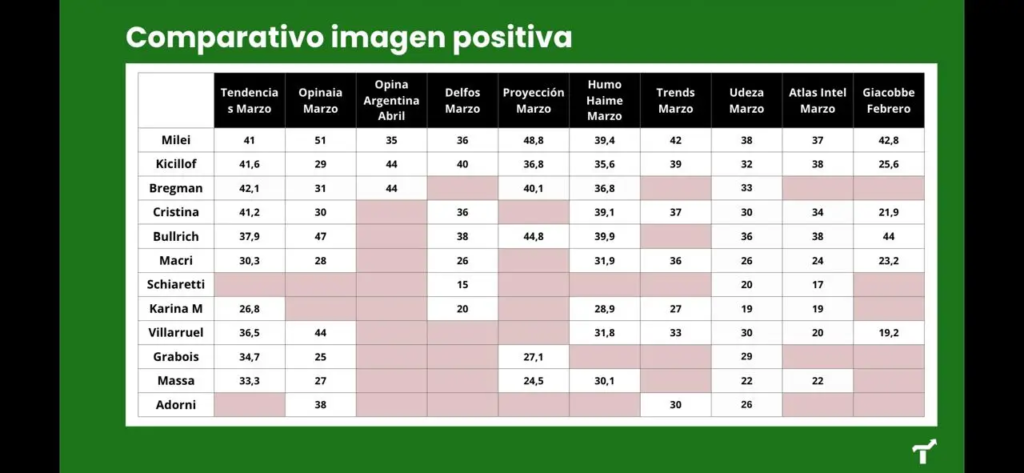Las encuestas coinciden en que viene creciendo desde entonces. El año pasado, sacó 9,1% en la Ciudad de Buenos Aires. Además de Tendencias, una consultora cercana al FIT, que le da 42,1% de imagen positiva, otras cuatro encuestadoras le asignan una imagen positiva superior al 30%: Opina Argentina, 44%, empatada con Kicillof y un punto por arriba de Cristina Kirchner; Proyección, 40,1%; Hugo Haime, 36,8%, y Opinaia, 31%.