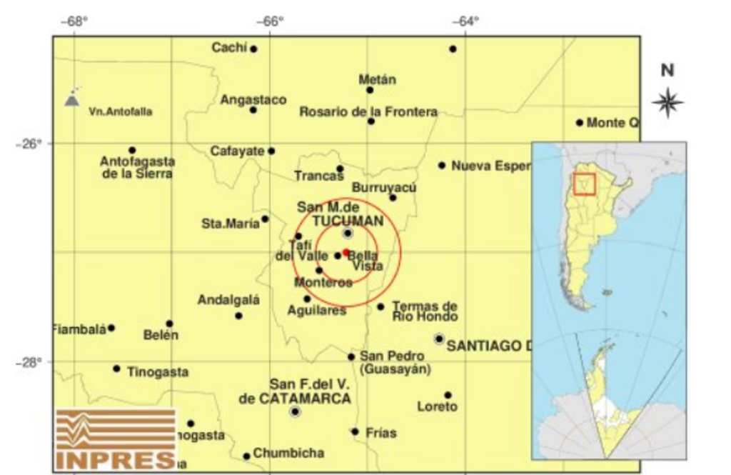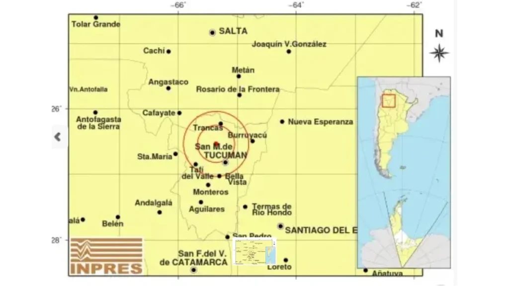 En el reporte difundido por el Inpres, también se consignaron las coordenadas del epicentro, localizadas en -27.001 de latitud y -65.215 de longitud.