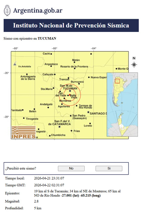 De acuerdo con los datos oficiales, el movimiento telúrico ocurrió a las 23:31 hora local. El organismo indicó que el epicentro se ubicó 19 kilómetros al sur de Tucumán, 34 kilómetros al noreste de Monteros y 65 kilómetros al noroeste de Río Hondo.