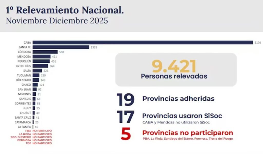 El Gobierno Nacional, a través del Ministerio de Capital Humano, difundió el primer relevamiento oficial de personas en situación de calle, identificando un total de 9.421 casos en las jurisdicciones participantes. En este contexto, la provincia de Tucumán registró 159 personas en esta condición. El informe representa un intento de construir una radiografía actualizada sobre la exclusión social, detallando perfiles, acceso a ingresos y condiciones de vida, aunque el dato es considerado parcial debido a que cinco provincias —incluyendo Buenos Aires y Santiago del Estero— no adhirieron al estudio.
