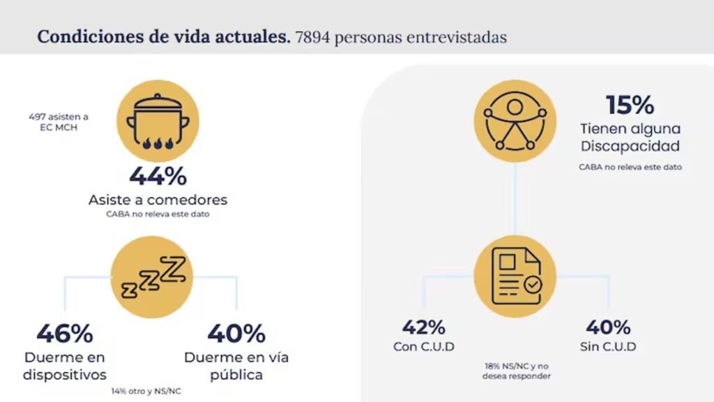 El informe advierte sobre la cronicidad del fenómeno, señalando que el 32% de los relevados lleva más de dos años viviendo en la calle. En cuanto a las necesidades básicas, el 44% depende de comedores comunitarios para alimentarse y el 40% duerme directamente a la intemperie sin acceso a centros transitorios. Otro punto crítico es la salud: el 15% presenta algún tipo de discapacidad, aunque menos de la mitad posee el certificado oficial para acceder a beneficios específicos. Desde el Ministerio destacaron que este relevamiento busca pasar de la respuesta intuitiva a una planificación basada en evidencia estadística.
