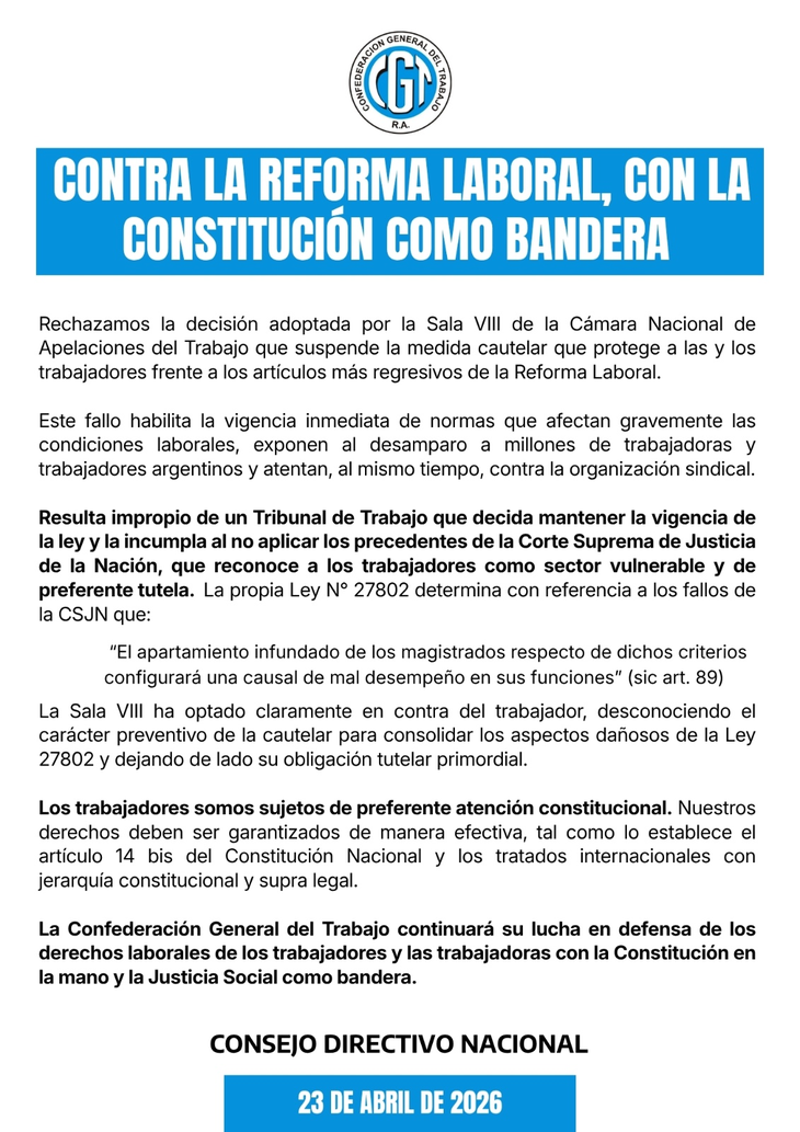 En el comunicado de este jueves, la CGT ratificó que insistirá con el rechazo a la reforma laboral y “continuará su lucha en defensa de los derechos laborales”. Al mismo tiempo, dejó un mensaje a los jueces: el fallo es “impropio” y podría configurar un causal de mal desempeño en sus funciones.
