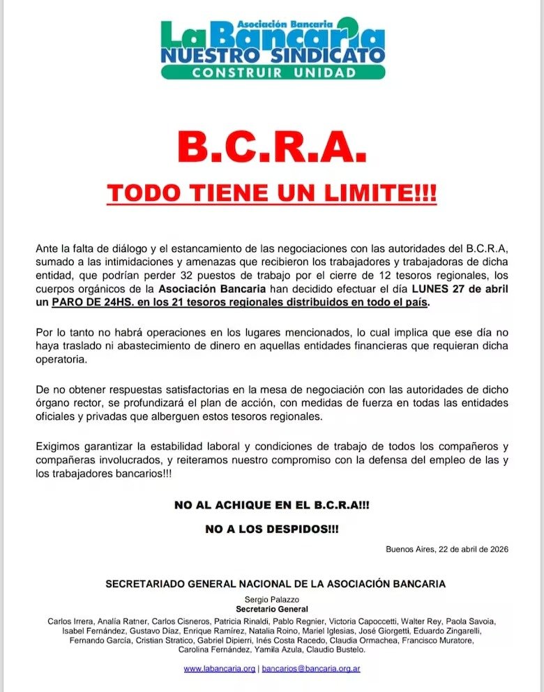 A través de un comunicado oficial, el gremio exigió que se garantice la estabilidad laboral y condiciones de trabajo dignas para todos los empleados involucrados en las áreas afectadas. La Bancaria reiteró su compromiso con la defensa de los puestos de trabajo frente a lo que consideran un avance sobre los derechos de los compañeros de las regionales. La jornada del lunes marcará así un punto de tensión clave en la relación entre el sindicato y la conducción del Banco Central, con el riesgo latente de que el conflicto se traslade al resto del sistema financiero nacional.